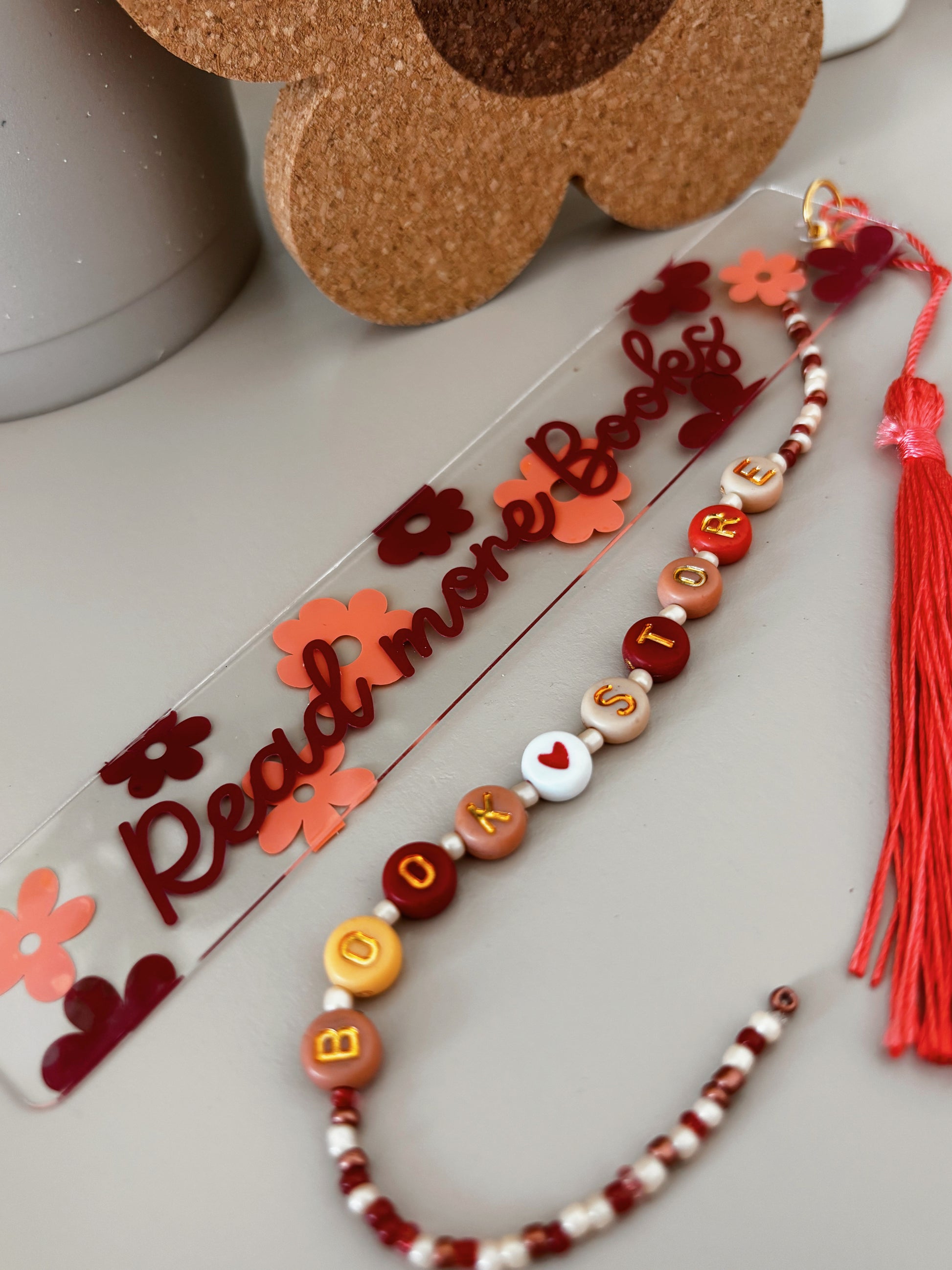 „Read More Books“ – Blümchen-Lesezeichen mit Perlenkette 🌼